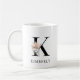 A pretty monogram black initial with pink watercolor floral and palmetto leaves coffee mug, with a stylish serif typeface with pretty curved serif initial in black, and a simple classic type name. Pink on black design. Letter k name monogram. Simply personalise with your name.
