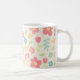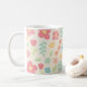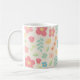 A delicate and feminine seamless pattern featuring a variety of small flowers in soft pastel hues of pink, blue, and yellow, interspersed with simple green leaves. The pattern is set against a clean white background, creating a cheerful and airy aesthetic.