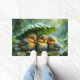 Cute fluffy birds hiding under leaf in rain doormat