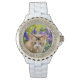 A lovely kitten on a rock in a flowery garden. A cute young redtabby baby cat with wonderful blue eyes, photo taken by Katho Menden. This rhinestone watch for women with dial-plate is a gift idea for cat and pet lovers. http://www.zazzle.com/kathom_photo