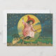The full moon is out and there's a cute little girl witch flying about! This vintage Halloween print depicts a little girl dressed as a witch flying around with her black cat. The stars and full moon are present to light her witching hour flight.