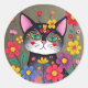 Cute Folk Art Black Cat and Flowers Classic Round Sticker