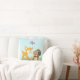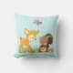 A pillow with a cute illustration featuring a baby deer and a little squirrel holding an acorn and a butterfly flying above their heads. These adorable woodland creatures on standing on some grass with some whimsical mushrooms by their feet. Light blue background.