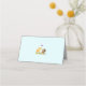 Place cards with a cute illustration featuring a baby deer and a little squirrel holding an acorn and a butterfly flying above their heads. These adorable woodland creatures on standing on some grass with some whimsical mushrooms by their feet. Light blue background.