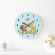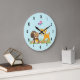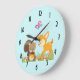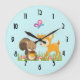 A clock with a cute illustration featuring a baby deer and a little squirrel holding an acorn and a butterfly flying above their heads. These adorable woodland creatures on standing on some grass with some whimsical mushrooms by their feet. Light Blue Background.