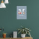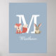 This cute blue poster features a woodland forest baby fox cub and bunny rabbit sitting on either side of the monogram and name. Designed by Thisisnotme©
