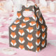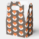 Cute fox favour boxes with a pattern of cartoon fox faces on a brown background.