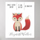 Nursery wall art with a watercolor fox in the middle and the name, weight, date of birth and length written in an elegant decorative font. Great decor for your baby's room.