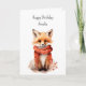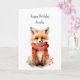 Birthday card with an illustration of a reddish orange fox pup. A subtle smile on his face. Wearing a nice red scarf for warmth.