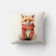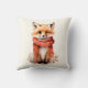A pillow with an illustration of a reddish orange fox pup. A subtle smile on his face. Wearing a nice red scarf for warmth.