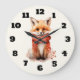 A clock with an illustration of a reddish orange fox pup. A subtle smile on his face. Wearing a nice red scarf for warmth.
