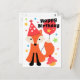Postcard featuring a cartoon illustration of a little fox with a cupcake and balloon wearing a party hat. Around him are colourful confetti stars. Text "Happy birthday". Illustration by MheaDesign. For any enquiries regarding the image or design, please contact me through my facebook page: https://www.facebook.com/MheaDesign