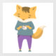 Cute cartoon fox in jeans having cup of tea
