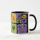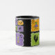 Embrace spooky season with a touch of charm! This delightful mug features an adorable lineup of Halloween favourites— a zombie, Frankenstein, ghosts, bats, and playful cats—each framed in vibrant shades of orange, purple, and green. Coquette bows add a whimsical, stylish twist, making each character pop against the sleek black background. Perfect for sipping your favourite hot beverages while celebrating the fun and festive spirit of Halloween!