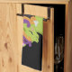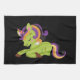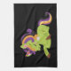 A kitchen towel with an image of a Frankenstein style unicorn. Purple and green colours. Spooky cute.