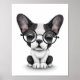 This cute design features a small french bulldog puppy with large black eyes. The dog is sitting down with its paws beside each other and is looking forward with its head slightly tilted to one side. The over sized head and small body along with the details in the fur create a beautiful combination of a cartoon and realistic look. Reading glasses sit on the pugs nose which gives the pattern a playful feel and intelligent feel. This unique and adorable french bulldog design is perfect for all dog and pet lovers.