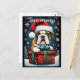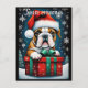 A cute baby bulldog with a Santa hat holding a Christmas gift.