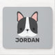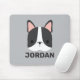 This design features cute French bulldog cartoon illustration with personalised name in grey modern sans serif font style on light grey background.