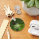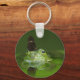 A cute green frog sitting on his lily pad in a pond, with his face poking out above the surface of the water. A curious butterfly sits on his nose. These cute critters look like they could be best friends