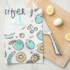 Kitchen towel with a cute fruit pattern line drawing style. Light green and yellow colours. A fun summery design. A white circle layered over top with your name and monogram initial inside.
