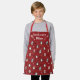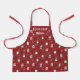 Fun festive red kids apron featuring a cute pattern with lovely penguins with red and light blue scarfs and red and black hats, decorated with snowflakes and Christmas trees. The caption on the upper part, decorated with stylised whisk and rolling pin, reads Sous Chef in white lettering and is customisable with the kid's name.