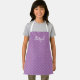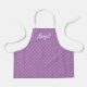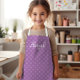 Cute kids' apron featuring a two-tone pattern of pale lavender polka dots on a darker lavender background. Personalise it with your child's name in a fun white curlicue font.