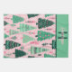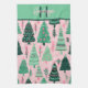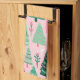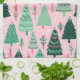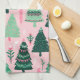 The Christmas-themed kitchen towel has a soft pink background with retro-style Christmas trees in varying shades of green, scattered in a repeating pattern. The trees feature simple triangular shapes with subtle pink ornaments and star toppers. A candy-cane striped border in soft pink and green frames the towel, adding a playful, vintage holiday charm.