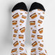 Fun food s’more socks with a fun pattern of smiling s'mores and decorative dots on a white background.