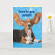 Cute Basset Hound with his ears raised up in the air with the caption, "Ears to you, [add name here]!" Inside it says, "Happy Birthday!" Funny birthday card for dog lovers (especially Basset Hound lovers).