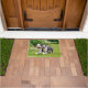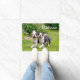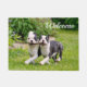 Two young happy Boston Terrier puppies, black with white markings, running side by side, carrying a stick and have a lot of fun. The Boston Terrier dog breed also called Boston Bulls or "American Gentlemen". A funny animal photo design by Katho Menden. This photo printing door mat welcome is a gift idea for dog lovers. Personalize it with your name or text.