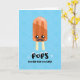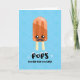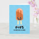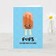 Cute and funny card featuring an adorable kawaii illustration of an orange popsicle with a mustache, the text "Pops, you're the coolest" in decorative snow-inspired typography set on a hand-drawn pattern of white dotted circles on a light blue background. Add your message in matching lettering on the inside. Perfect for celebrating dads especially on Father's Day.