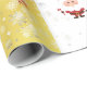 Cute, funny, and also elegant custom-name Christmas wrapping paper for kids with Santa in his red costume (holding a candy cane) and his favourite reindeer, Rudolph, behind him; with the greeting "Merry Christmas!" in cursive script / calligraphy and with very cute Christmas trees with baubles. With a personalised name. The design includes silver and off-white snowflakes and stars for a festive holiday mood. On a partly golden background.