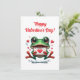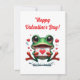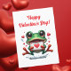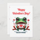 A bright, adorable green frog sitting holding a valentine card, surrounded with cute little hearts.The words “Hoppy Valentine’s Day!” are playfully written in fun lettering above the frog.