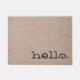 Cute, funny, simple, modern Hello modern typography font hi hipster humour quote on a faux burlap jute rustic chic doormat.
