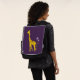 Funny giraffe backpack with a cartoon giraffe nibbling on a light purple flower and holding some flowers with its tail while roller skating, on dark purple background. This cute giraffe design will appeal to girls who love giraffes and cute cartoon illustrations, as well as the purple colour. It will make a great gift for a skater girl, too.