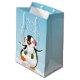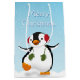 A cute winter illustration featuring a clumsy penguin in a good mood wearing gloves and earmuffs walking in the snow.