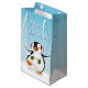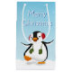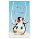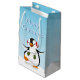 A cute winter illustration featuring a clumsy penguin in a good mood wearing gloves and earmuffs walking in the snow.