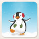 A cute winter illustration featuring a clumsy penguin in a good mood wearing gloves and earmuffs walking in the snow.