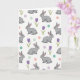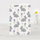 Designed with a repeating pattern on a white background, this card features many gray long-eared rabbits 🐰 shown in calm seated poses, with soft pink inner ears and noses and small dark eyes that seem to glance gently toward one another. Light shading under each rabbit adds a bit of depth, like they’re resting together on a quiet spring day. Between them, small purple flowers with slender green stems appear like little bouquets, adding a sweet, friendly touch 🌷. Scattered around the pattern are round polka dots in pastel pink, mint green, lavender, and teal, drifting between the animals and blooms. The overall look feels tender and companionable, as if the rabbits are sharing a soft, unspoken moment side by side. A short Easter greeting sits near the top in a soft purple color, centered and easy to read against the white space. The flowers show simple petal shapes with thin green stems tucked between the rabbits and pastel dots.