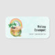 A name tag with an adorable illustration featuring a smiling green and gold pot with a cute rainbow,