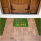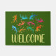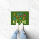 Welcome mat with colourful geckos cute lizards original Australian art illustration by artist Sacha Grossel featuring these cute reptiles on an eco green simple natural background. Colourful and vibrant.