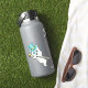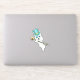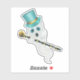 This vinyl sticker is a cute white ghost with big blue eyes wearing a blueish green top hat with a gold ribbon holding an ornate black cane topped with a gold skull.
