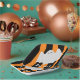 Add some festive fun to your Halloween party with these paper plates featuring a cute cartoon ghost who says "boo!". With a bright and modern orange and black stripe background, these plates are sure to be a hit at your gathering. Great for both kid and adult Halloween parties, or even fall/October birthday events. May be personalised with your own text, if you wish.