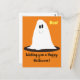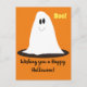 Colourful image featuring a sweet smiling ghost with big friendly black eyes. The ghost says boo which appears in yellow text. The ghost in blobby white shape stands on a black spot and the card has an orange background. Text in black script says “Wishing you a happy Halloween.” Order one card or multiples at checkout.