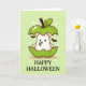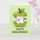 Send spooky yet adorable greetings with this cute kawaii-inspired Halloween greeting card featuring a playful illustration of a ghost slurping a worm inside a poisonous green apple. The card's mint green background is decorated with tiny bats and stars, adding a whimsical and fun touch to your Halloween wishes. Perfect for anyone who loves a mix of cute and spooky, this card brings a delightful charm to the Halloween season. Whether for friends, family, or party invitations, this kawaii ghost Halloween card will make your message stand out in the most fun and festive way.