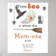 Featuring cute watercolor of baby ghost and Halloween aesthetics. A little boo is almost due! Halloween themed baby shower with watercolor ghost, black cat, witch's hat, magic mop ( broomstick ), spider hanging from a web. The little ghost is eating a lollipop.