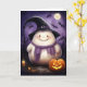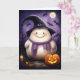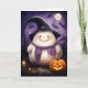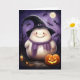 Cute ghost wearing a witch's hat and scarf, with a jack-o'-lantern and candles in a spooky forest.