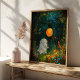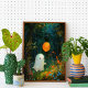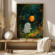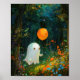 A friendly ghost floats through a magical forest, surrounded by colourful flowers carrying an orange balloon. This adorable poster is perfect for adding a touch of whimsy and enchantment to your Halloween decor.