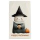 A sweet and friendly ghost in a starry wizard hat holding a cup of coffee (or hot cocoa) brings a playful twist to Halloween style. With the phrase “Happy Halloween,” this design is perfect for children’s products like hoodies, T-shirts, blankets, mugs, or greeting cards. Its soft, cute aesthetic makes it ideal for kids who love the fun side of spooky season, while still keeping the festive Halloween spirit alive.