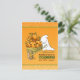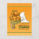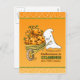 Funny cute ghost takes wheelbarrow with happy pumpkins. Postcard with my illustration.